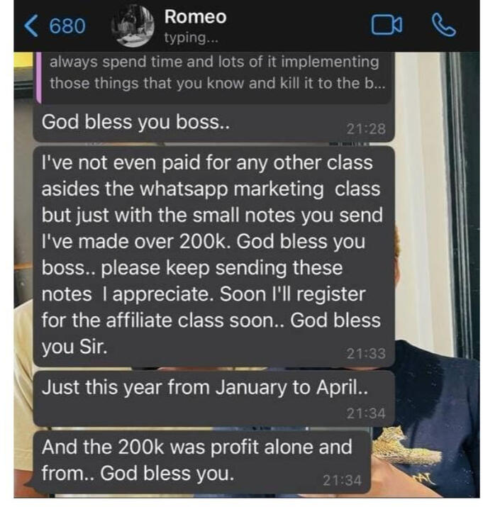 Romeo made 200k in profits alone from notes on the WhatsApp marketing class, now imagine if you get the course for yourself with everything in it